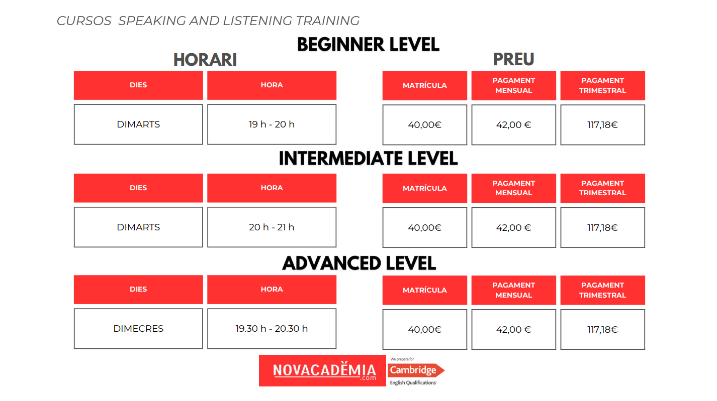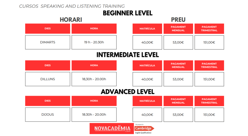 Tots els alumnes que s’apuntem a un curs d’speaking a NOVACADÈMIA tenen accés privat i gratuït a un campus online ple de materials per seguir practicant a casa així com dels materials i continguts treballats a classe.