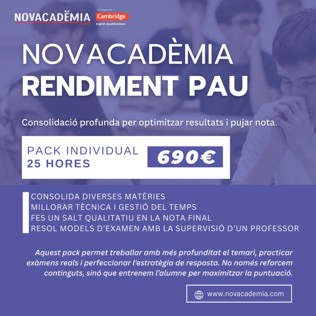 - Si vols consolidar continguts i pujar nota a la PAU → Pack Rendiment (25h)