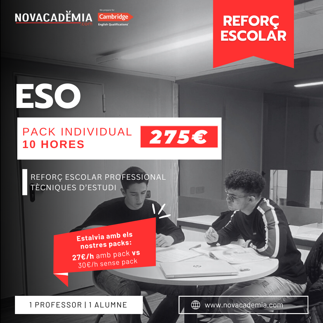 “Focus total: millora la teva atenció i concentració” Si et distreus fàcilment o et costa mantenir la concentració mentre estudies, aquest pack t’ensenyarà eines pràctiques per entrenar l’atenció, eliminar distractors i potenciar la teva capacitat de treballar de manera eficient i sense interrupcions. Amb el nostre pack de reforç individual de 10 hores, no només obtens un suport personalitzat per als teus estudis, sinó també aprens a posar en pràctica diverses tècniques d’estudi.